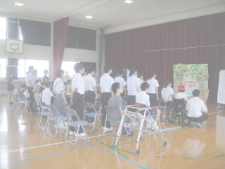 | 本校では、隔週の金曜日の登校後、全校児童生徒が集まり、「おはよう集会」を行っています。「おはよう集会」の内容は、新しく赴任された先生の紹介、転出入児童生徒の挨拶、各委員会からのお知らせなどです。 |