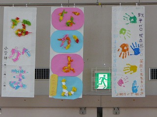 | 本校プレイルームで平和集会が行われ、各学級・学年で考えた平和宣言文を発表しました。また、総合的な学習の時間で調べた戦争についての発表、戦争に関する紙芝居の読み聞かせなどそれぞれの学級で取り組んだことを発表し、平和について考えました。 |
