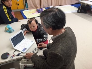 ○補聴器を新たに買い替えようと考えていらっしゃる保護者が最新の補聴器を試聴したいということで相談がありました。補聴器が決まったら、聴力検査の結果を基にその子の聞こえに合うよう調整をした補聴器で試聴に入ります。