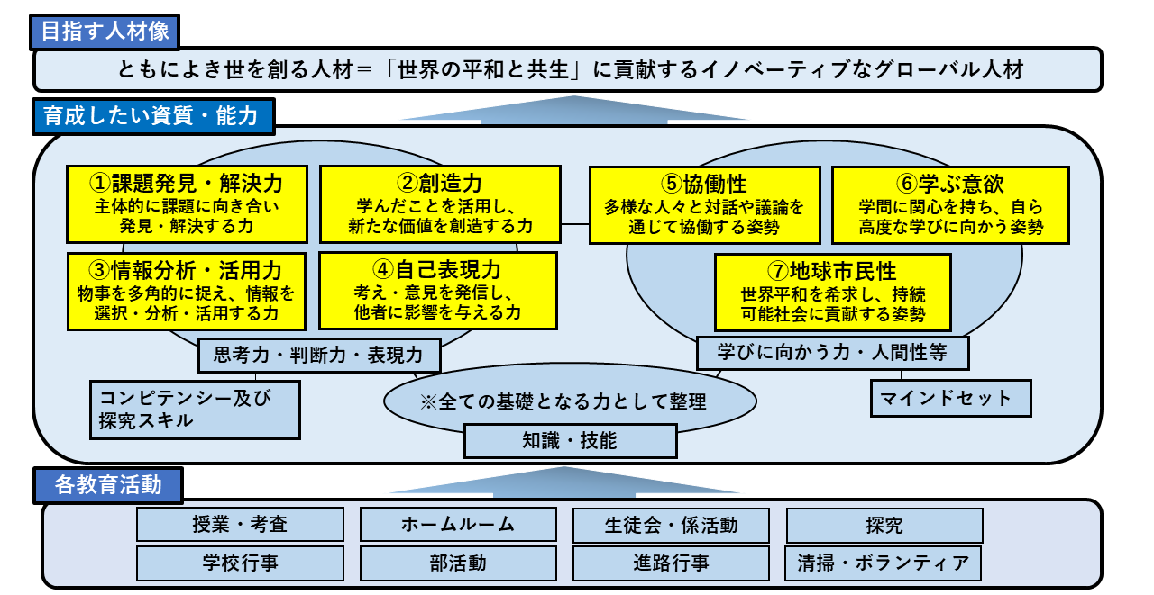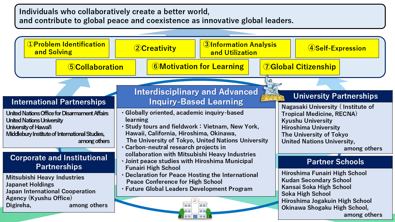 本校は、文部科学省「WWL(ワールド・ワイド・ラーニング)コンソーシアム構築支援事業」の拠点校であり、また三菱みらい育成財団「心のエンジンを駆動させる教育プログラム」の採択校として、「『世界の平和と共生』に貢献するイノベーティブなグローバル人材の育成」をテーマに、先進的かつ特色ある教育活動を展開しています。