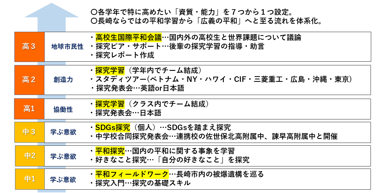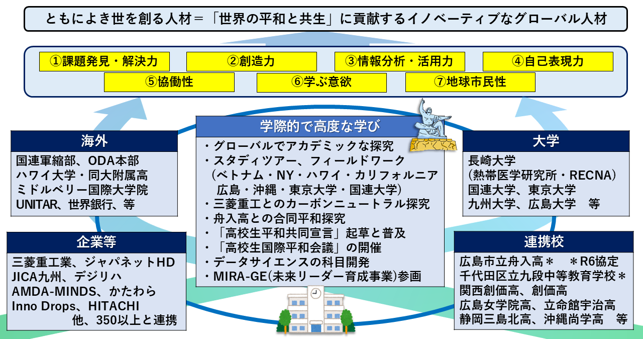 被爆地・長崎に根ざした平和教育を基盤としながら、学びを SDGs や現代社会の諸課題へと発展させ、「広義の平和」をテーマとした探究を行っています。