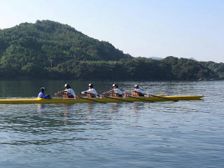 ○6月19〜21日にかけて九州大会に行ってきました。大会が行われた三隈川は日田市内を流れる清流で夜になると鵜飼が行われる水域です。コース設定は川下から川上に向けてゴールする方向なので、どちらかというとタイムが出にくいコースです。しかし何しろたったの500m。ゴールタイムは2分を切るスプリントレースになりました。初日は予選を2位で通過しました。しかし午前10時に何もすることがなくなったので、サッポロビール日田ビール工場へ工場見学に行きました・・・。1本のビールができるまでの工程をわかりやすく説明していただきとても勉強になりました。二日目の準決勝は4艇レース。1位のみしか決勝に行けない厳しいレースでした。レースは最初から水をあけられる苦しい展開でした。ゴールタイムは1位からは10秒も離され、短距離漕の練習不足を痛感しました。しかし、各県の1位2位のクルーと互角に戦える確かな手ごたえを感じて大会を終えることができました。次の新人戦に向けて一歩一歩歩んで行ってもらいたいものです。