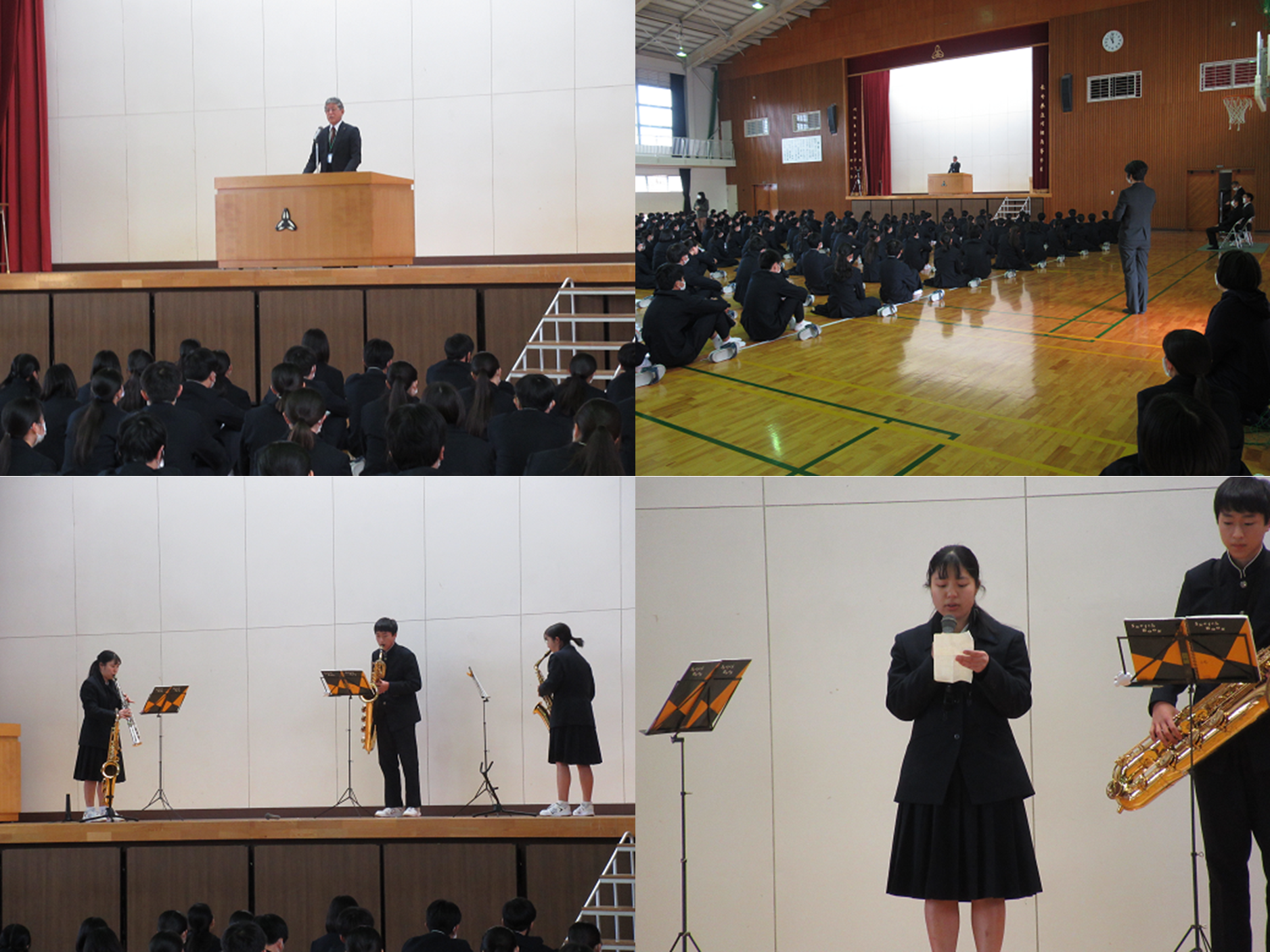 | 1月14日(金) 吉田周平先生離任式&大学入学共通テスト壮行式 1月14日(金)朝のSHR前に、2学期からお世話になっていました数学科の吉田周平先生の 離任式が放送で行われました。3年生の授業を中心に、部活動等で大変お世話になりました。 またいつかお会いできるのを楽しみにしております。 また、4校時には、明日から始まる令和4年度大学入学共通テストを受験する3年生38名の 壮行式が行われました。校長先生、学年主任の樋渡先生の激励の挨拶の後、生徒の代表に よる決意表明が行われました。その後、激励に駆け付けた先生方より、本番に向けてのアドバ イスをいただき式は終了しました。 ![]() |