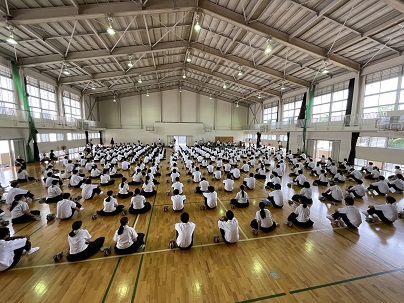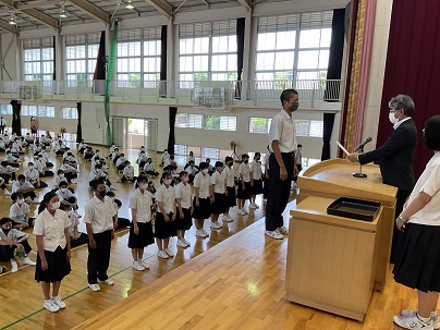 | 7月20日(火) 表彰式 生徒会役員任命式 コーラス部・吹奏楽部演奏披露 カルロス先生退任式 1学期終業式 7月20日(火)は午前中のみ授業を行い、午後から表彰式、生徒会役員任命式、コーラス部 ・吹奏楽部の演奏披露・ALTカルロス先生退任式、1学期終業式を行いました。 表彰式では陸上部3年田中悠朔君の第20回長崎県高等学校陸上競技選手権大会3000 mSC第2位の表彰が行われました。引き続き、令和3年度生徒会役員任命式が行われ、生徒 会長鴨川健治君が挨拶を行い、全校生徒へ今後の抱負を話しました。 表彰式 生徒会役員任命式 表彰式・任命式終了後、7月22日コーラス部、7月25日吹奏楽部が出場するコンクールの 課題曲及び自由曲の演奏披露が行われました。久しぶりの全校での音楽鑑賞で、心やすらぐ ひと時でした。 演奏後は、3年間お世話になりましたALTのカルロス先生の退任式が行われました。校長先 生の紹介のあと、カルロス先生から最後のスピーチをいただきました。カルロス先生の今後の ご活躍を祈念して、コーラス部と吹奏楽部による校歌演奏で最後の時間を過ごしました。 退任式後、予定していた1学期の終業式は、熱中症対策のため、教室で放送により行われま した。1学期が無事終了したことと、今後について校長先生や生徒指導部の小宮先生からお話 がありました。 |