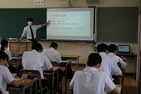 ◎研究授業 本校には今年度も長崎大学教育学部大学院の学生が長期実習に来ており、本日2時間目に2年生文系クラスで研究授業を行いました。該当クラスには大学の教官も来られ、電子黒板などのICT機器を活用した漢文の授業の様子を廊下から見守られていました。 |